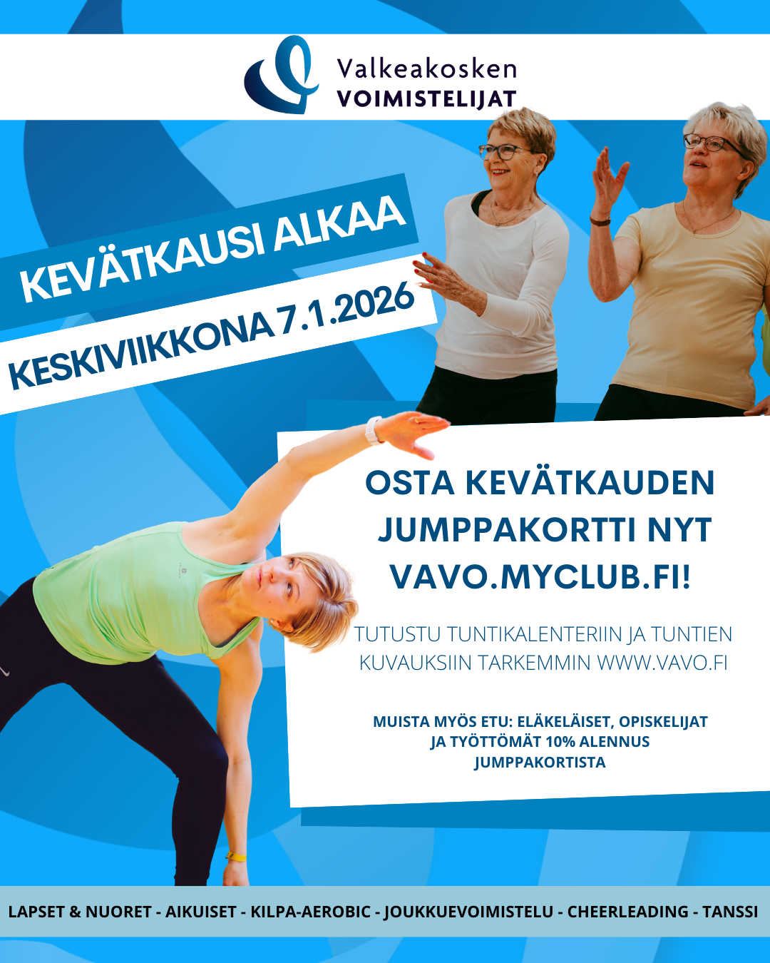 Valkeakosken Voimistelijoiden harrasteryhmien kevätkausi alkaa keskiviikkona 7.1. Voit ilmoittautua kaikkiin harrasteryhmiin ja ostaa aikuisten jumppakortit suoraan myClubin kautta vavo.myclub.fi.…