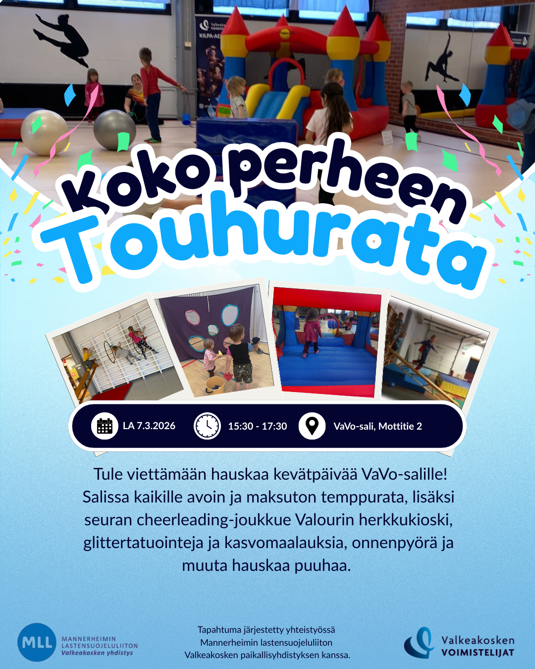 VaVo-salilla hauskaa puuhaa koko perheelle lauantaina 7.3. klo 15:30-17:30. Salissa kaikille avoin ja maksuton temppurata, lisäksi tapahtumassa seuran cheerleading-joukkue Valourin herkkukioski,…
