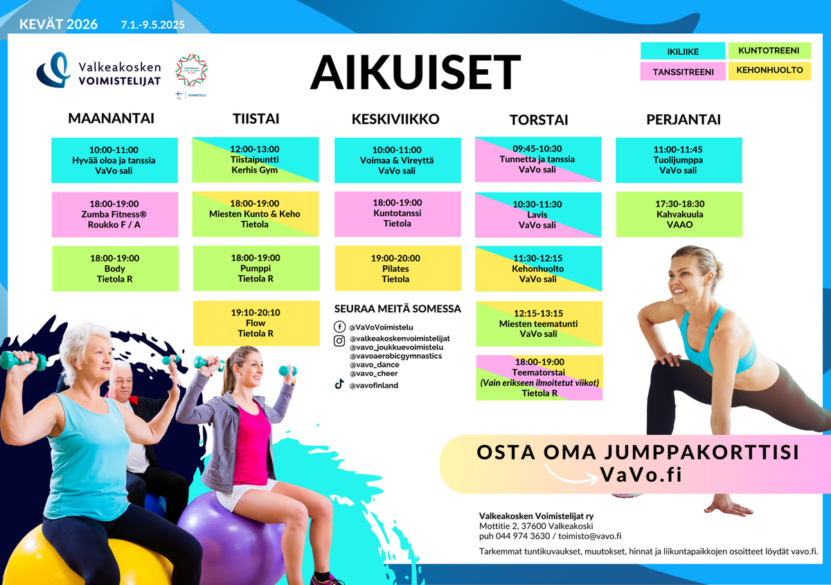 Muutokset ovat mahdollisia. Seuraathan aktiivisesti Jumppien teemat ja peruutukset -sivustoa. Ilmoitamme äkilliset peruutukset myös Facebook-sivuillamme ja Instagram-tilillä.