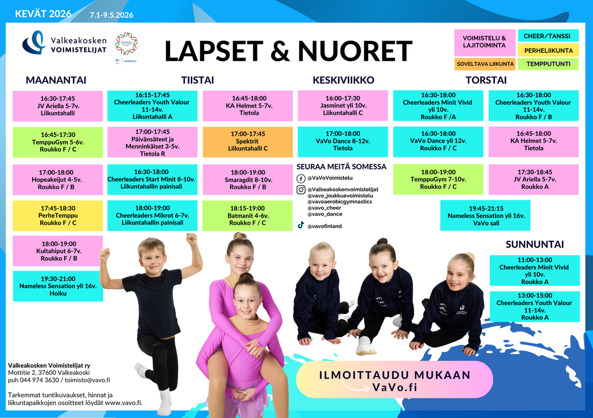 Muutokset ovat mahdollisia. Seuraathan aktiivisesti Jumppien teemat ja peruutukset -sivustoa. Ilmoitamme äkilliset peruutukset myös Facebook-sivuillamme ja Instagram-tilillä. Lasten ja nuorten ryhmissä ohjajaat käyttävät aktiivisesti tiedottamiseen myClub-sovellusta, olethan ladannut puhelimeesi myClubin?