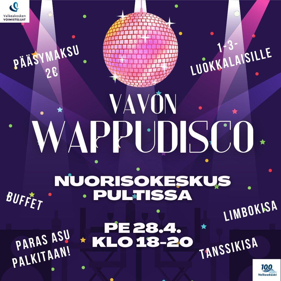 Wappudisco 1-3-luokkalaisille nuorisokeskus Pultissa perjantaina 28.4. klo 18-20.