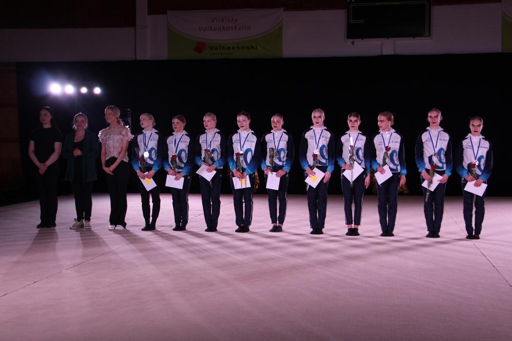 Joukkueessa voimistelevat: Roosa Niskavaara, Nella Lehtinen, Minea Pasanen, Taika Imeläinen, Oona Mäkelä, Inga Romaniv, Hertta Pietilä, Ella Myllynen ja Hilla Borg.
